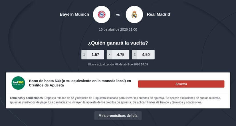 En este artículo encontrarás las apuestas Bayern vs Real Madrid más limpias para la vuelta, las cuotas que me has pasado para bet365, probabilidades en porcentaje, resumen de la ida, historial, lectura táctica, TV en España y una predicción clara tanto para los 90 minutos como para la clasificación a semifinales.