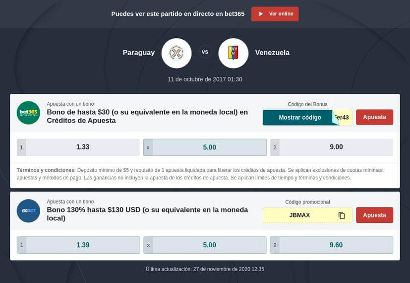 ¿Quieres apostar el partido Paraguay vs Venezuela? Regístrate en 1xbet y aprovecha el bono exclusivo de $130. Para obtener el bono de bienvenida utiliza el código 1x_405. Otra opción muy interesante es la casa de apuestas bet365. Ofrece una amplia gama de deportes para apostar. Los usuarios pueden ver las transmisiones en directo de los mejores acontecimientos deportivos. También los partidos de las Eliminatorias Sudamericanas. Además, las cuotas son muy altas comparando con otras casas de apuestas. bet365 tiene el bono de bienvenida para nuevos usuarios de hasta $100.