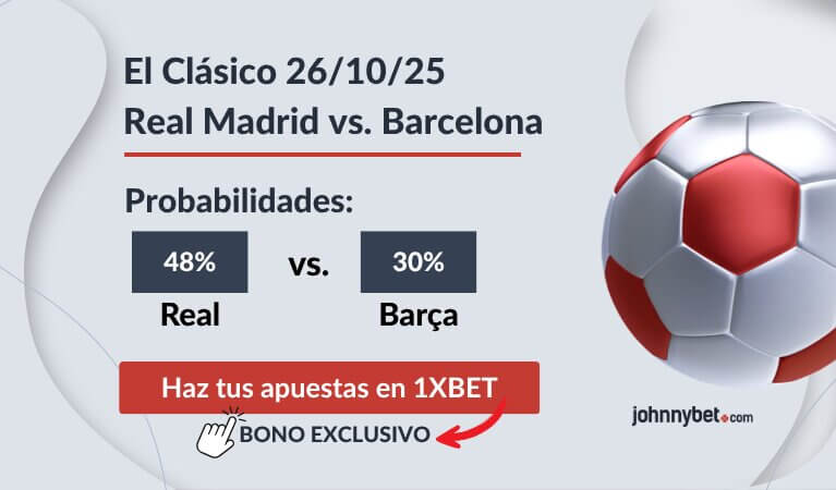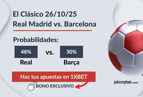 El pronóstico Real Madrid vs Barcelona El Clásico del 26 de octubre de 2025 será uno de los partidos más seguidos del mundo. Basándonos en la forma actual y estadísticas oficiales, las probabilidades aproximadas son: Real Madrid 48% de probabilidad de ganar (cuota en 1XBET @2.09), Barcelona 30% (cuota en 1XBET @3.34), Empate 24% (cuota en 1XBET @4.18).