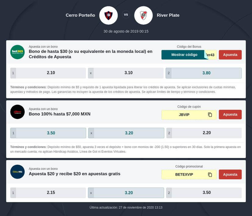 Para el encuentro de los cuartos de final partido de vuelta, la casa mexicana ofrece la cutoa 2.6 por la victoria de Cerro Porteño, 2.8 por la victoria de River Plate y 3.1 en caso de empate.